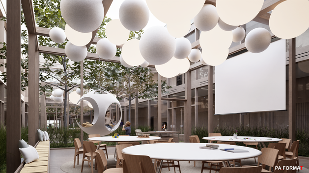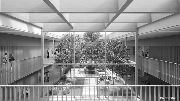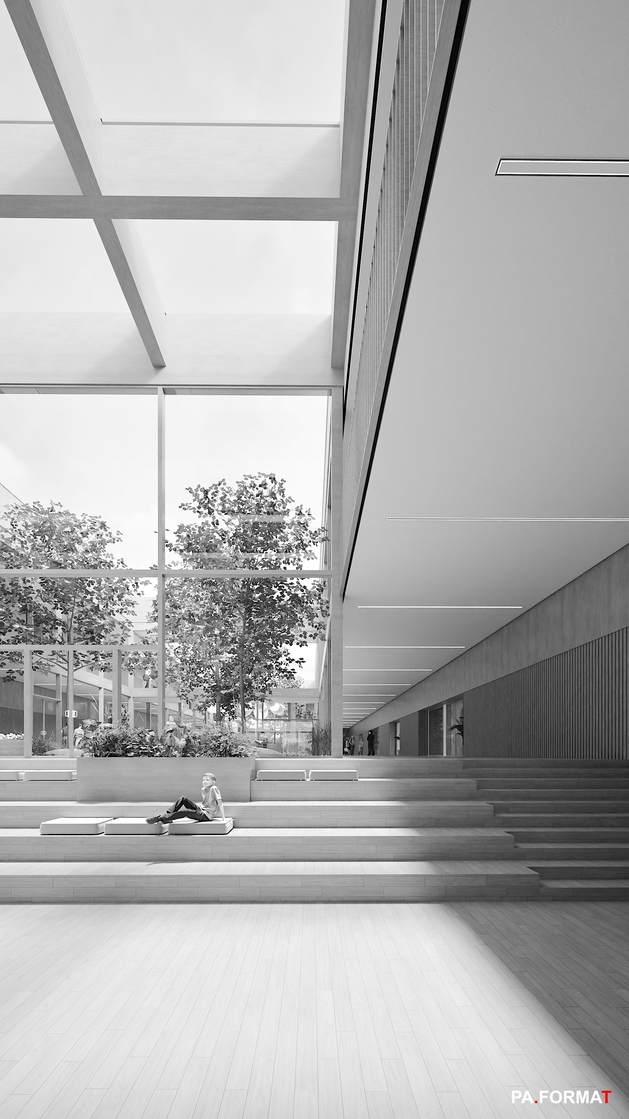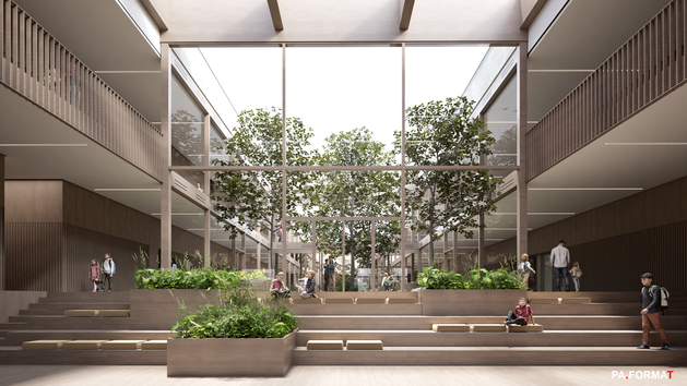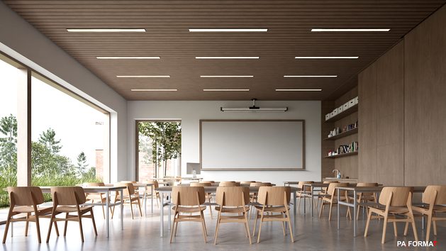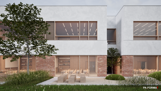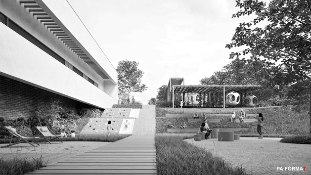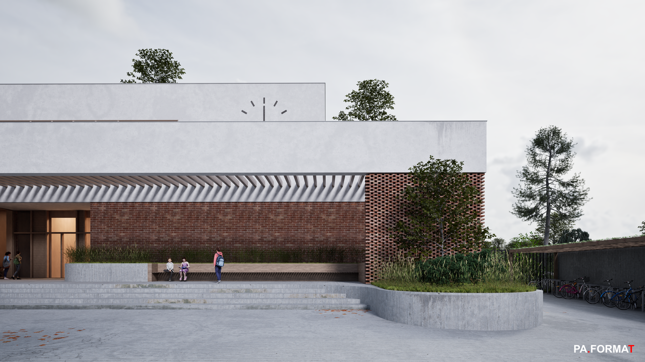 Zielone ogrody, nasadzenia, dachy klimatyczne i retencyjne, nie tylko zdobią i oczyszczają powietrze, ale uczą, jak bliskość natury wpływa na nas i nasze myślenie. Sercem szkoły staje się nie tylko sala lekcyjna, lecz także wewnętrzne patio, dziedziniec otwarty na światło i dźwięki pór roku, gdzie słychać śmiech i gwar współpracy.