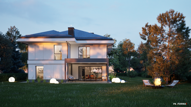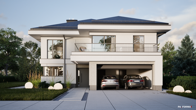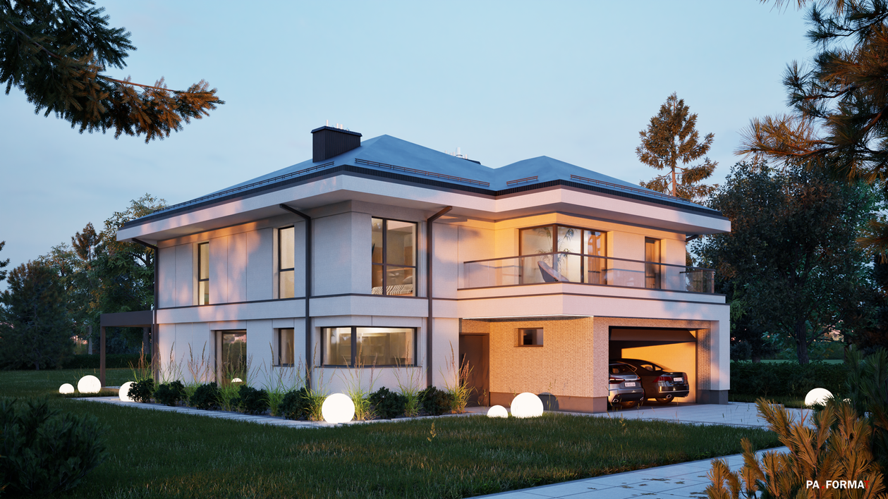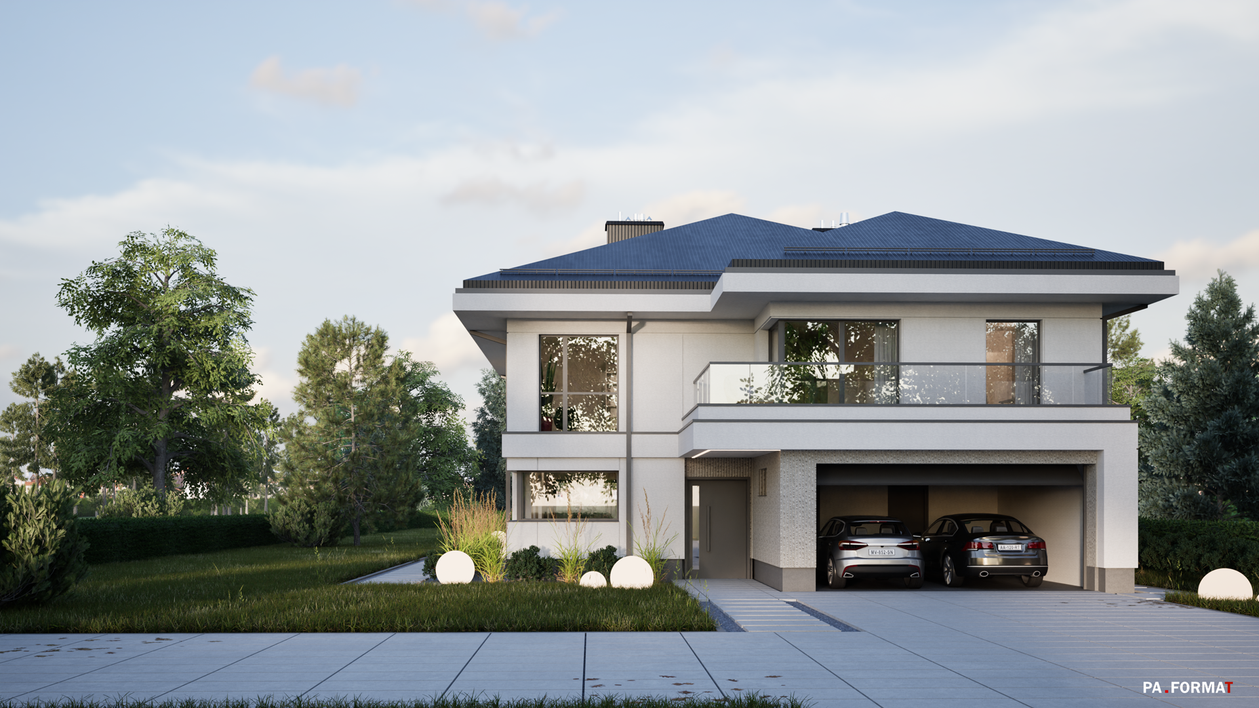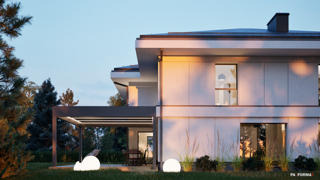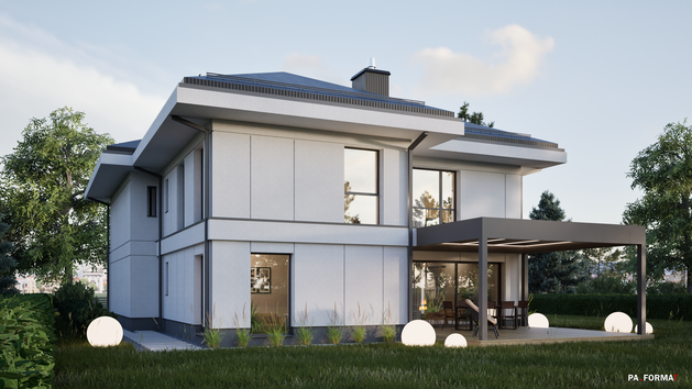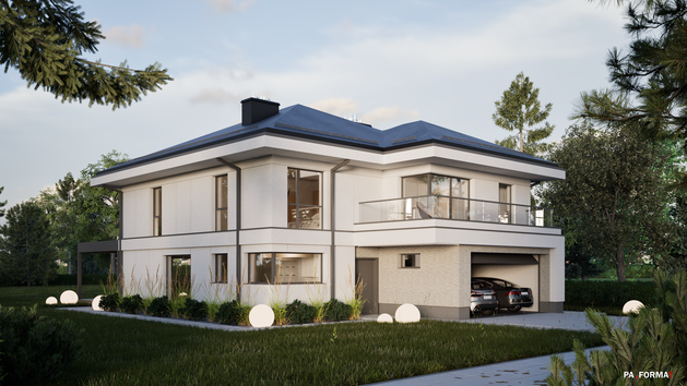 Współczesny dom jednorodzinny, w popularnej konwencji zwartej bryły z wysuniętymi okapami.